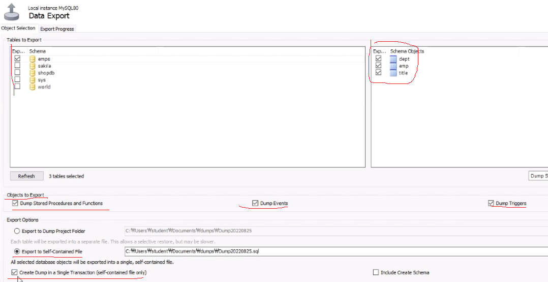 내가 내보내고자하는 테이블 선택, Stored Procedures, Events, Triggers등을 선택. 위의 빨간줄 모두 선택