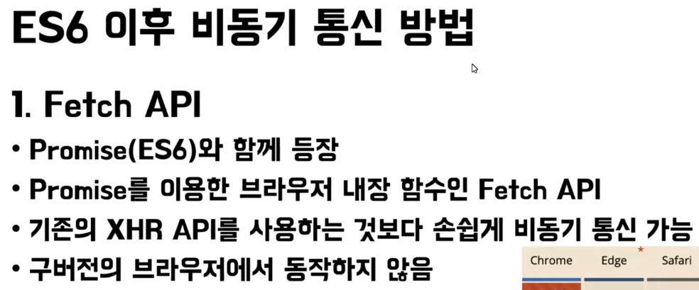 ES6이전에 XHR API를 사용했었고 XHR을 사용한 것이 AJAX였다. 따라서 내 생각에는 AJAX와 Fetch는 구분되어야 하는 것이다. AJAX는 ES6이전 서버와의 비동기 통신 방법이었다면 Fetch API는 ES6이후 서버와의 비동기 통신 방법인것이다.