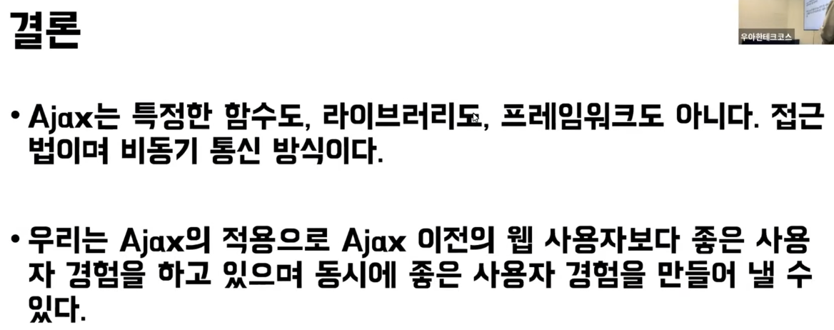 즉, Ajax란 다양한 기술들(HTTP, CSS, JS, DOM, XmlHttpRequest, etc)을 이용하여 싱글 스레드인 JS를 보완하기 위한 비동기 통신 방식이다.