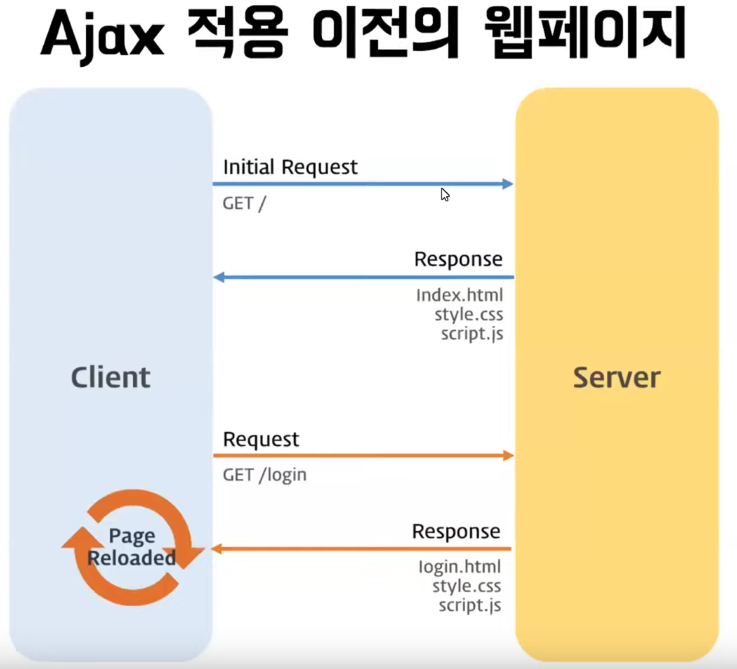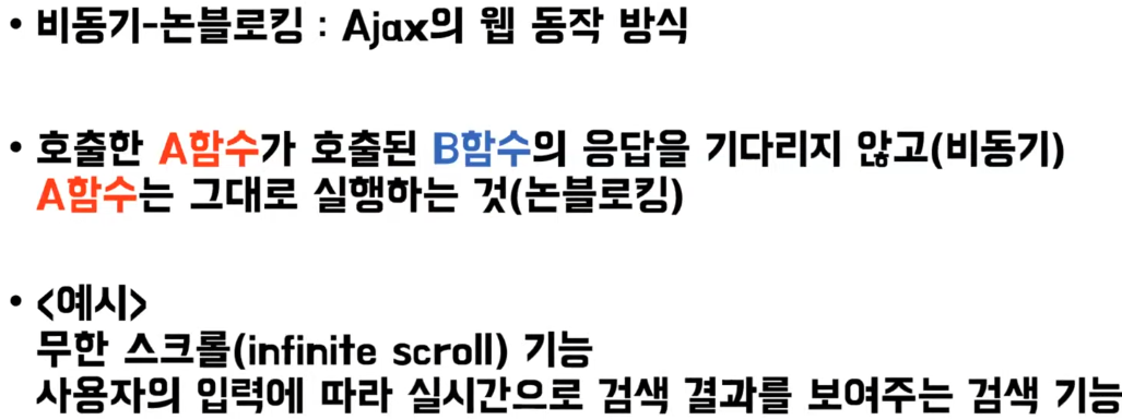 - 즉, JS를 사용해 서버에 데이터를 비동기 방식으로 요청하는 것( 비동기 방식은 웹페이지를 리로드하지 않고 데이터를 불러오는 방식이며 Ajax를 통해서 서버에 요청을 한 후 멈추어 있는 것이 아니라 그 프로그램은 계속 돌아간다는 의미를 내포하고 있다)
