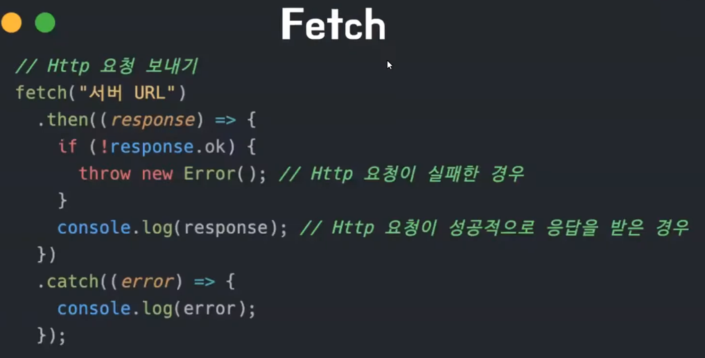 Fetch는 xhr(XmlHttpRequest)처럼 http요청 전송기능을 제공하는 클라이언트 사이드 Web API이다!!! Fetch는 XmlHttpRequest와는 달리 추가적으로 Promise까지 지원한다.