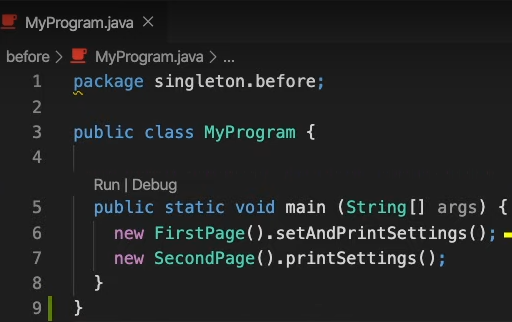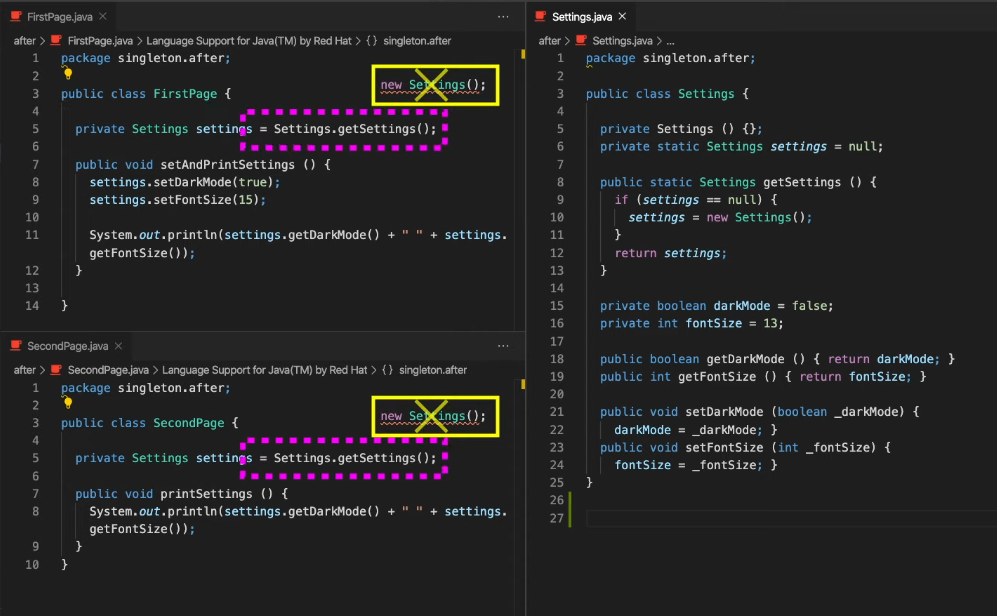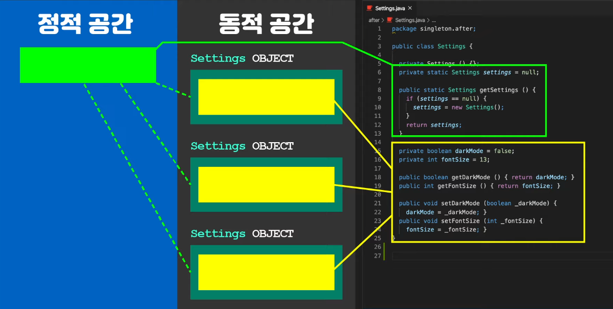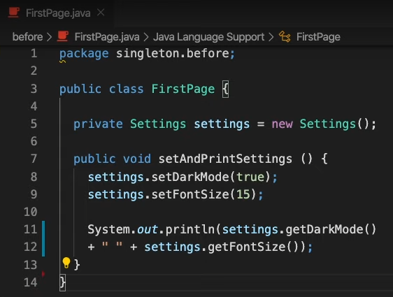 예를들어 Modile phone에서 다크모드로 설정시 어떠한 앱을 사용하건 간에 모두 다크모드가 적용되어야 함. 이것은 세팅을 관리하는 객체는 반드시 같은 것을 사용해야 한다는 말이다. 아래는 Settings라는 클래스로 darkMode여부와 fontSize를 상태로 지닌다.