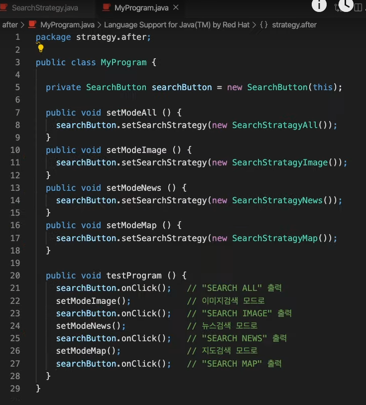 각각의 버튼들의 역할은 MyProgram 클래스에 있는 setModeAll, setModeImage,... 의 함수의 역할을 함. 즉, 버튼을 누르면 setMode~함수가 호출되고 그 안에서 버튼의 setSearchStrategy메서드가 호출되어 searhStrategy의 값이 변하게 됨. 따라서 만약에 이미지 검색의 방식이 변경되면 해당클래스인 SearchStrategyImage클래스를 찾아 내용을 변경하면 되는 것이다(위에서 보인 전략패턴을 사용하지 않은 코드는 해당 행위에 대한 클래스가 따로 존재하지 않고 따라서 그에 관한 코드를 변경할라치면 뭔가 복잡함을 지금도 느낌). 그리고 만약 새 검색방식이 추가 되면 그 검색방식에 해당하는 클래스를 SearchStrategy...라는 이름으로 만들어 주면 된다.