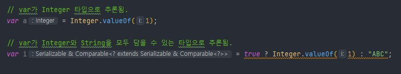 위 코드는 인텔리제이에서 써본 코드인데 var 자리에 들어갈 타입을 우변을 참고하여 추론했고 이를 IDE가 표시해준 모습입니다. 즉, 컴파일 타임에 var 키워드를 적절한 타입으로 추론해서 교체한다는 것을 알 수 있습니다.