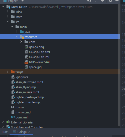 프래임워크를 사용하는데있어 주의할 점은 내가 프래임워크라는 이미 짜여진 틀에 맞추어 코딩해야 한다는 것이다. 즉, 내코드에서 어떤 이미지 파일을 사용하고 싶다면 그 이미지 파일은 이미 정해진 어떤 경로에 있어야 한다. 왜냐하면 프레임워크라는 것이 이미지라는 것이 있을때 정해진 경로에 있는 파일에서 그 이미지 파일을 찾기 때문이다. 예를들면 JavaFX라는 프래임워크에서 이미지 파일은 내가 별도로 경로를 정해주지 않는이상 아래그림에 있는 이미 만들어져 있는 폴더인 resources 폴더에서 이미지 파일을 찾는다.