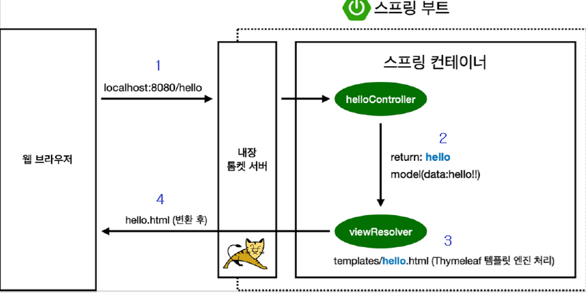 3.Spring Boot내부에 viewResolver가 resource/templates폴더에서 화면을 찾아서 처리한다.