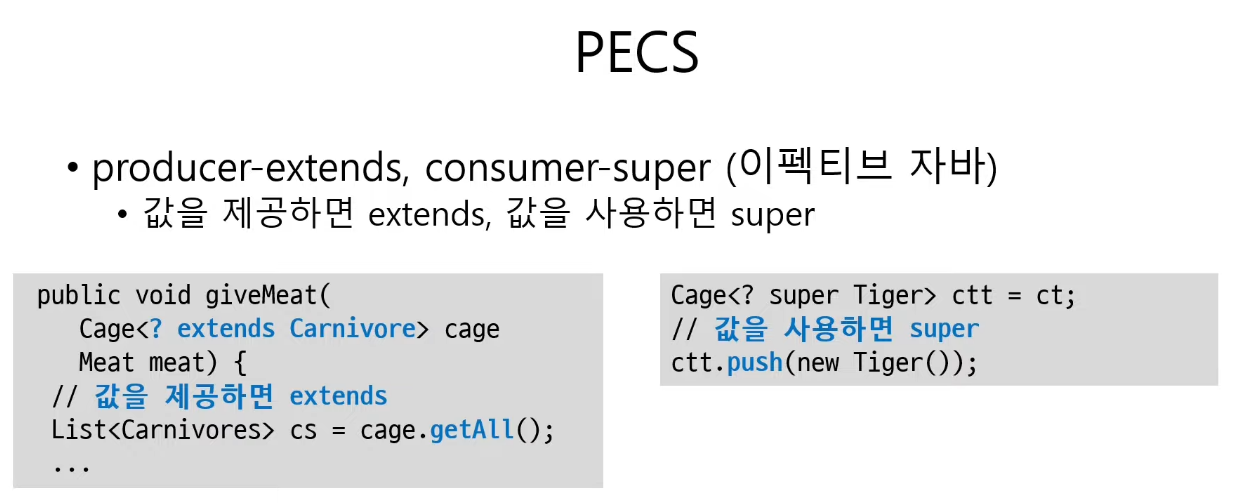 (바로 위의 공변성, 반(공)변성의 개념을 객체지향 설계에서배운 LSP에 적용하자면 공변성은 메서드의 반환타입과 반변성은 메서드의 매개타입 변수와 연관된다. LSP을 지키면서 하위 클래스에서 메서드를 재정의 한다는 것의 의미: 메서드의 사전 조건은 약화시키고(=반공변성=매개변수로 더 상위타입의 인자 사용 = <? super XXX>) 사후 조건은 강화(=공변성=반환타입으로 더 구체적인 하위의 타입사용= <? extends XXX> )시킨다.