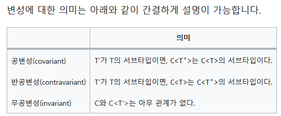 공변성: 어떤 요소가 다른요소(여기서는 저네릭)에 영향을 주는것. T'가 T의 서브타입이면 C<T'>는 C<T>의 서브타입임.(자바에서는 <? extends T>의 형식으로 공변성을 만들수 있음)