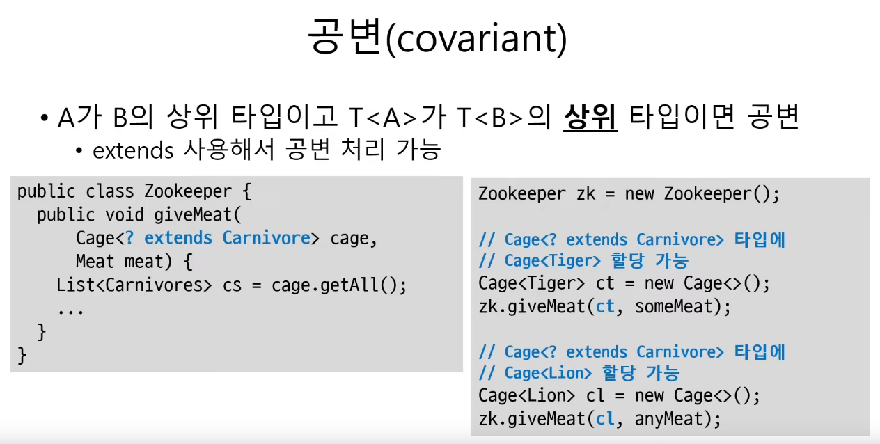 Carnivore은 Tiger의 상위 타입임. 그리고 <? extends Carnivor>은 <Tiger>의 상위타입임. 즉 기본 타입의 관계가 다른 요소인 와일드카드를 사용한 저네릭에서의 관계에 영향을 줌. 따라서 이는 공변성의 예.