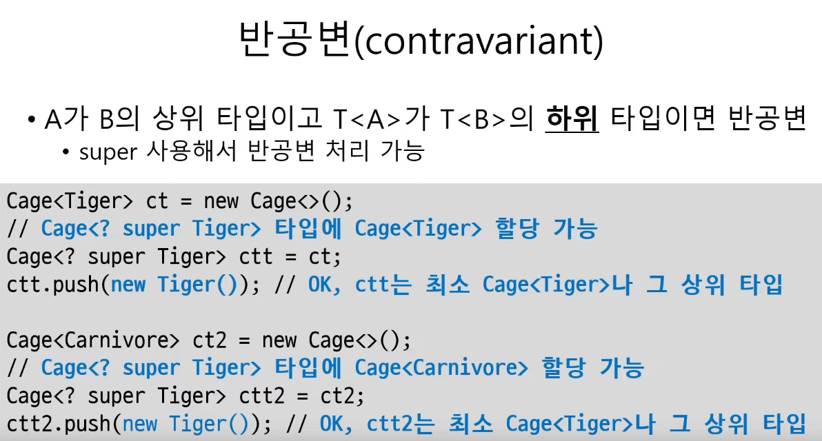 저네릭 자체의 무공변성때문에 생기는 문제(출처 동영상 참고)를 해결하기 위해서 와일드카드<? extends Carnivore> 를 제공하여 저네릭이 더이상 무공변성이 아닌 공변성이 있게끔 한다. 하지만 공변성이 생겼다 하여 모든 문제가 해결되는게 아님. 이 남아있는 문제를 해결해 주기 위해 등장한 것이 반공변성(ContraVarient)이다.