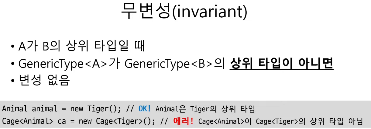 여기서 변하고 변하지 않고의 기준은 어떤 관계(예를들면 부모 자식)가 있을때 다른 어떤 요소의(예를들면 저네릭이라는 요소)관계에 영향을 주는가의 문제임. 자바의 저네릭을 예로 들면 A가 B의 상위타입이라고 했을때 GenericType<A>는 GenericType<B>의 상위타입이 아님. 즉A가 B의 상위타입임에도 불구하고 저네릭이라는 다른 어떤 요소에서는 GenericType<A>가 GenericType<B>의 상위타입이 아니므로 변하는게 없음. 즉 저네릭은 그 자체는 무변성임.