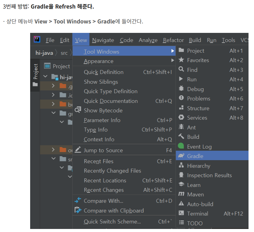한동안 Spring framework를 사용하지 않다고 오랜만에 다시 켰고 프로젝트 전반의 모든 파일에 걸쳐 뻘건 밑줄이 쳐져 있었다. 왜 이런 문제가 발생하나? 찾아보니 import가 제대로 되지 않아 생긴문제라 한다. 나는 의아했다. 기존 코드에서 잘만돌아가고 하나도 손댄게 없는데 오랜만에 다시 돌릴려고 프로젝트 불러오니 import가 제대로 되지 않았다고? 나는 손댄게 하나도 없는데? 정확한 원인은 나도 잘 모르겠지만 아무튼 import가 제대로 되지 않았다 하고 오랜만에 켜서 라이브러리를 잘 인식하지 못하는 것으로 나름 추측한다. 그래서 아래글에 소개되어 있는 1,2번 과정없이 바로 3번, Gradle의 Dependencies를 Refresh해준 것이다. 1,2번 없이 바로 3번으로 했더니 해결되었다.