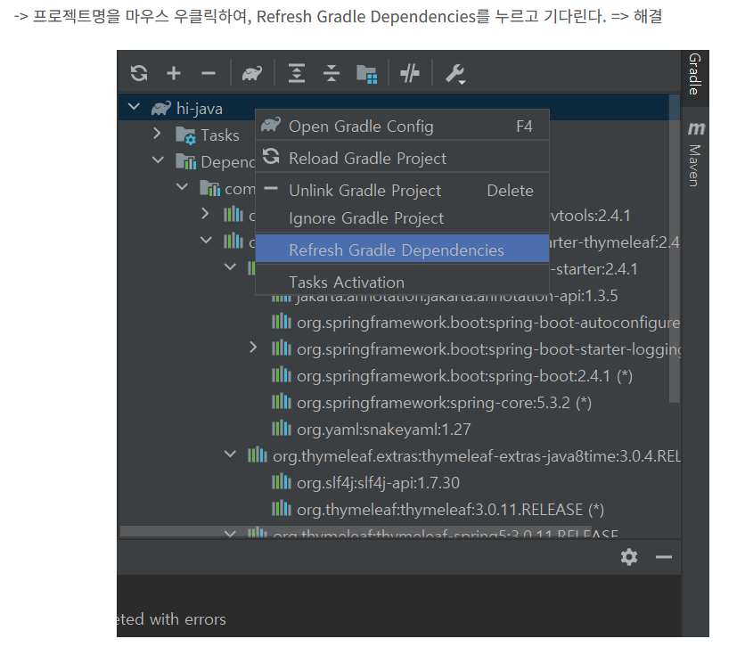 한동안 Spring framework를 사용하지 않다고 오랜만에 다시 켰고 프로젝트 전반의 모든 파일에 걸쳐 뻘건 밑줄이 쳐져 있었다. 왜 이런 문제가 발생하나? 찾아보니 import가 제대로 되지 않아 생긴문제라 한다. 나는 의아했다. 기존 코드에서 잘만돌아가고 하나도 손댄게 없는데 오랜만에 다시 돌릴려고 프로젝트 불러오니 import가 제대로 되지 않았다고? 나는 손댄게 하나도 없는데? 정확한 원인은 나도 잘 모르겠지만 아무튼 import가 제대로 되지 않았다 하고 오랜만에 켜서 라이브러리를 잘 인식하지 못하는 것으로 나름 추측한다. 그래서 아래글에 소개되어 있는 1,2번 과정없이 바로 3번, Gradle의 Dependencies를 Refresh해준 것이다. 1,2번 없이 바로 3번으로 했더니 해결되었다.