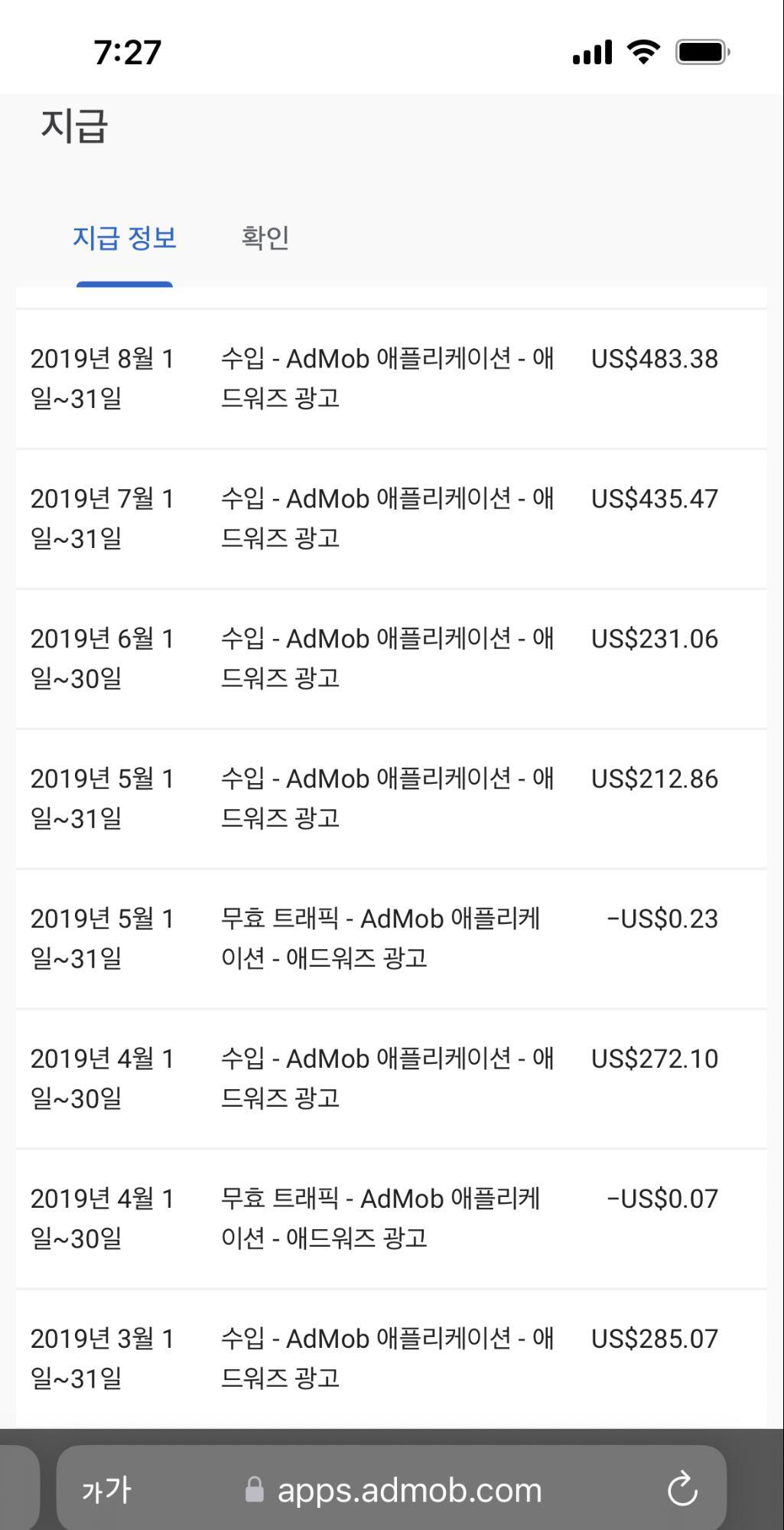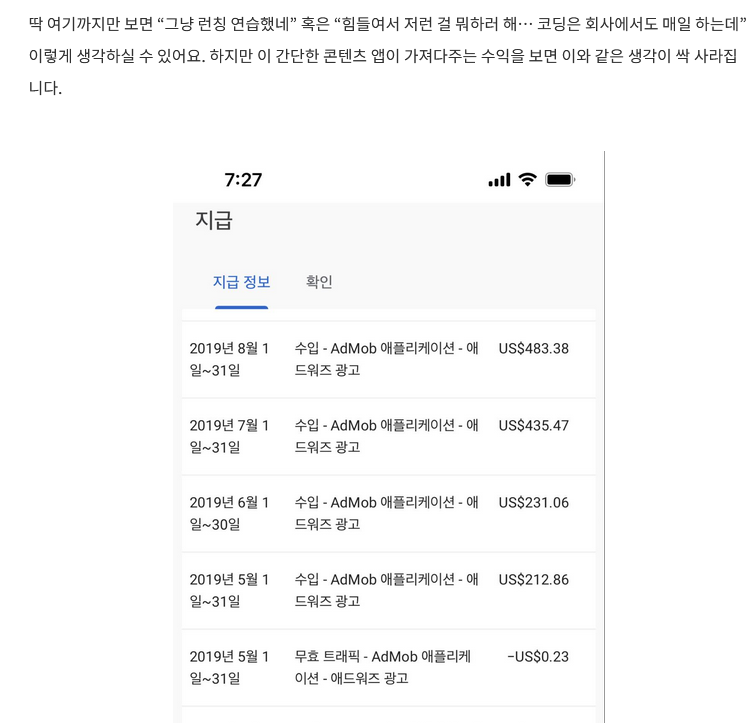 딱 여기까지만 보면 “그냥 런칭 연습했네” 혹은 “힘들여서 저런 걸 뭐하러 해… 코딩은 회사에서도 매일 하는데” 이렇게 생각하실 수 있어요. 하지만 이 간단한 콘텐츠 앱이 가져다주는 수익을 보면 이와 같은 생각이 싹 사라집니다.