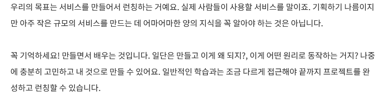 꼭 기억하세요! 만들면서 배우는 것입니다. 일단은 만들고 이게 왜 되지?, 이게 어떤 원리로 동작하는 거지? 나중에 충분히 고민하고 내 것으로 만들 수 있어요. 일반적인 학습과는 조금 다르게 접근해야 끝까지 프로젝트를 완성하고 런칭할 수 있습니다.