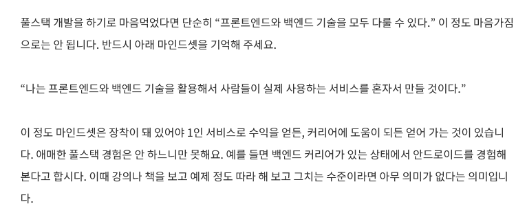 이 정도 마인드셋은 장착이 돼 있어야 1인 서비스로 수익을 얻든, 커리어에 도움이 되든 얻어 가는 것이 있습니다. 애매한 풀스택 경험은 안 하느니만 못해요. 예를 들면 백엔드 커리어가 있는 상태에서 안드로이드를 경험해 본다고 합시다. 이때 강의나 책을 보고 예제 정도 따라 해 보고 그치는 수준이라면 아무 의미가 없다는 의미입니다.