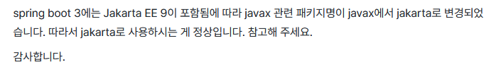 로 javax -> jakarta로 변경하니 해결되었다. 즉 특정 버전(Jakarta EE9)이 추가됨에따라 패키지 명이 변할 수 있으니 이점 참고 하여 import 문제시 생각해 보자!