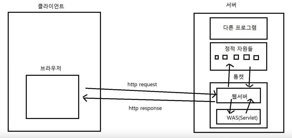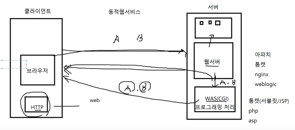 정적 웹서비스 같은 경우 클라이언트로부터 request가 오면 웹서버가 가지고 있는 자원을 가지고 response로 보내면 되는데 동적 웹서비스 같은 경우는 웹서버라는 개념말고 WAS(CGI)라는 개념이 등장함. 이 WAS(Web Application Server)는 프로그래밍 처리(내가 이전에 짜놓은 프로그램 코드)를 통해서 클라이언트로부터 온 요청에 대한 응답(요청에 대한 결과물)을 실행시간에 생성해냄.
