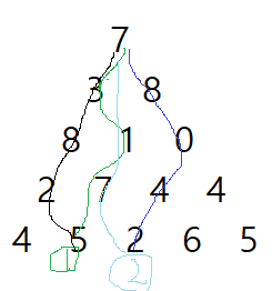 하지만 1번 열을 제외하고는 상황이 달라진다. 왜냐하면 이전 행의 이전열로부터 영향을 받기 때문인데, 예를 들어 3층의 1번 값에 누적될 결과는 (2층의 3번에 누적된 값 + 자신의 값) 또는 (2층의 8번에 누적된 값 + 자신의 값) 중 큰 값을 골라야 한다.