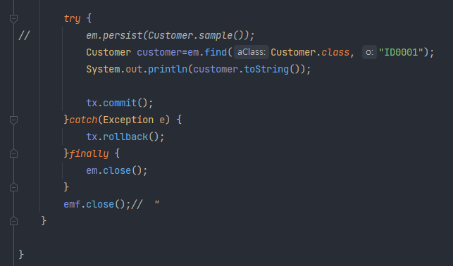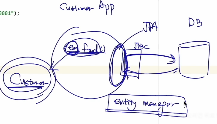 EntityManager가 가지고 있는 find메서드의 반환형은 Customer객체이다. 이전에 배웠듯이 EntityManager는 jpa에 속하고 jpa는 jdbc를 기반으로 한다. jdbc가 db로 부터 가져온 ResultSet의 데이터를 이용하여 결과적으로 EntityManager의 find함수는 Customer객체를 생성해 내야 한다. 많은 생성자가 있을수 있지만 find메서드가 가장 먼저 찾는 생성자는 (find메서드 뿐만 아니라 다른 어떠한 메서드도 마찬가지일 것이다)Default 생성자이다. 하지만 나는 따로 default생성자를 만들어주지 않았으므로 오류가 나는 것이다. 즉 여기서 알아두어야 할 것은 어떠한 라이브러리에 있는 메서드가 반환하는 것이 객체이고 그것을 받아 사용하기 위해서는 내 측에서는 반드시 그 클래스에 대한 default생성자가 기본적으로 존재해야 한다는 것이다.