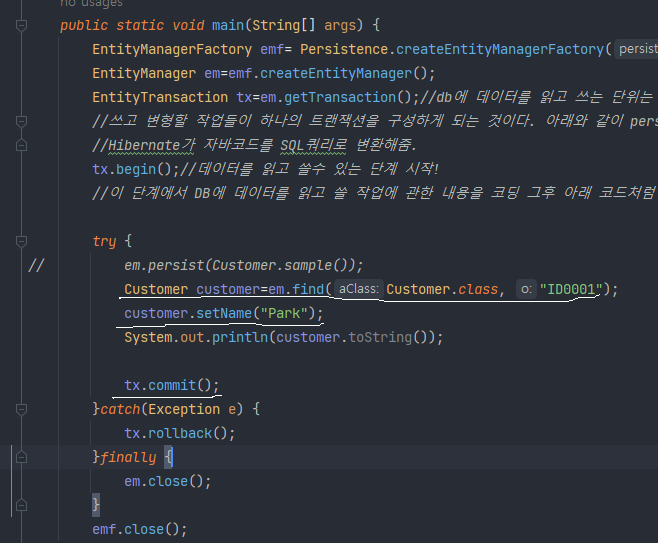 또한 DB에 update를 해달라는 요청을 EntityManager에게 하지 않았음에도 update가 이루어졌다는 것도 주목해야함. 어떻게 이것이 가능함? 위에서 조회된 Customer객체(find메서드가 반환하는 객체)는 이미 JPA의 EntityManager가 관리하는 영속객체임. 따라서 이 객체를 수정하고 commit해주면 따로 EntityManager에게 update요청을 하지 않더라도 DB의 원본데이터를 수정하는 update SQL쿼리가 날라가게 되는 것입니다.