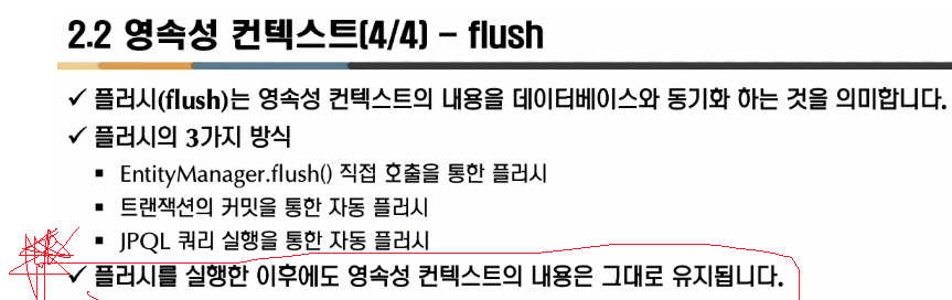 flush()의 기능은 DB와 Persistence Context간의 동기를 맞춘다(동기화) 라는 정도로 이해하시면 됩니다.