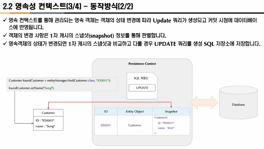 위의 Update쿼리가 생성되는 경우를 좀더 자세히 설명하면 이렇다. em.find(Customer.class, "ID0001");로 DB로부터데이터를 가지고온다(1차 캐쉬의 데이터를 가지고 온다고 생각해도 좋음) => 그렇게 정보를 가져온직후 PersistenceContext의 스냅샷을 찍는다. => setName("Song")을 통해 정보가 update되었다. => 찍어두었던 1차 캐시의 스냅샷정보와 현재 PersistenceContext의 상태를 비교한다.=> 만약에 다를 경우 update SQL쿼리를 생성하여 쓰기지연 SQL저장소에 저장한다. => commit혹은 flush시점에 DB로 쿼리를 날린다.