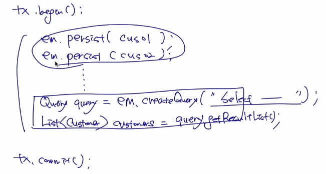 위와 같이 하나의 트랜잭션의 시작(tx.begin())과 끝(tx.commit())사이에 위와 같은 코드가 있다고 한다면 1,2행의 persist(cus01), persist(cus02)코드 때문에 쓰기지연SQL저장소에는 Insert~~와 같은 SQL쿼리가 대기하고 있을것이다. 왜냐하면 아직 commit되기 전이기 때문에. 그런데 이 상황에서 나는 위와 같은 JPQL를 통해 전체 고객들을 가져온다음에 customers라는 리스트에 담고 싶은 것입니다. 이때 JPQL쿼리를 실행한다면 실행되기 전 자동flush()가 일어나게 되어 쓰기지연 SQL저장소에 있었던 쿼리까지 모두 DB로 동기화되어 기존DB에 있었던 내용을 동기화하여 그 동기화된 내용의 데이터를 Persistence Context로 가져올수 있게 되는 것이다! 이것이 바로 위에서 말했던 "flush()를 통해 동기화 하면 마치 DB에 반영되는 것과 같은 결과를 해당 트랜잭션 내에서 확인할 수 있다"의 의미임.
