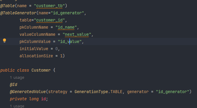 이상으로 JPA에서 기본키를 생성하는 3가지 방법을 살펴보았습니다. (1. Identity를이용한 기본키 생성, Sequence이용한 기본키 생성(@SequenceGenerator), Table을 이용한 기본키 생성(@TableGenerator))(복습해 보자면 @GeneratedValue어노테이션을 사용한다는 것은 직접 기본키를 생성하는 것이 아닌 DB에서 생성하는 기본키를 사용한다는 의미임).