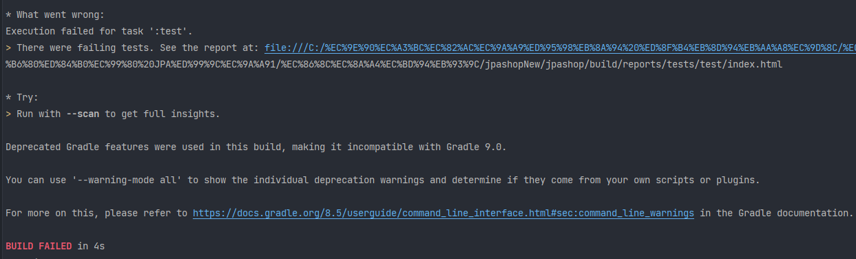 What went wrong:Execution failed for task ':test' 이라는 오류가 계속해서 나왔었고 나는 맨 처음에 이 문제가 오류 아래에 나와있는 Deprecated Gradle features were used in this build, making it incompatible with Gradle9.0