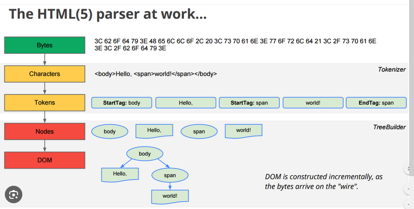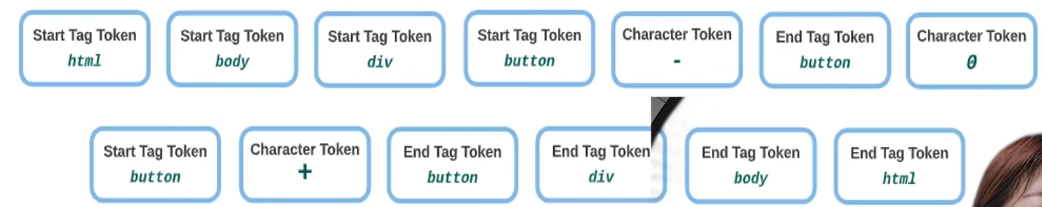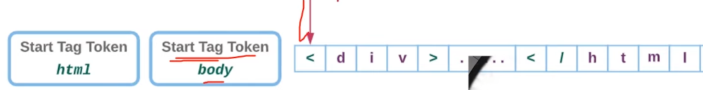 위 그림에서 랜더링엔진을 좀더 살펴보자(렌더링 엔진의 최종목표는 Render Tree그리는 것인거같음. 내생각). 브라우저는 어떻게 화면을 그리는 걸까? 우리가 인터넷 주소를 입력한다고 브라우저는 그것을 알수없다. 브라우저가 이해하는 것은 IP주소이다.주소를 입력하면 DNS(Domain Name System)를 거쳐 해당주소의 IP주소를 얻어옴(이 IP주소를 얻는 과정이 단순하지가 않음).얻어온 주소는 DNS cache에 저장하여 다음에는 따로 DNS에 묻는 과정을 없앰.그 후 얻어온 IP주소에 해당하는 서버로 가서 웹페이지를 요구함. 이때 서버로 부터 얻는 페이지의 내용을 인코딩하여 브라우저로 가져오고 브라우저는 그 인코딩된 내용을 디코딩한다. 그렇게 디코딩하여 얻어낸 문자들을 가지고 Token을 만들어낸다. 이 토큰화과정을 가치면 비로써 우리가 알아볼수 있는 문서(Document)가 생김. 브라우저는 이 문서를 하나씩 하나씩 읽음(like, 아 head태그구나, body태그구나 하면서). 이 과정을 Tokenizer(토큰화)과정이라고함. 즉 브라우저가 문서를 읽고 토큰이라는 결과물들을 만들어내는 것임. 마치 아래 그림처럼.