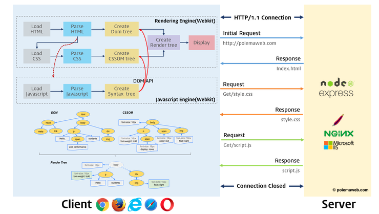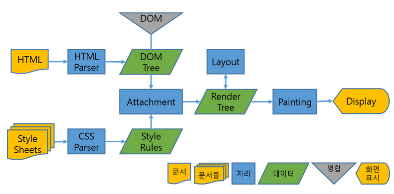 브라우저의 핵심 기능은 사용자가 참조하고자 하는 웹페이지를 서버에 요청(Request)하고 서버의 응답(Response)을 받아 브라우저에 표시하는 것이다. 브라우저는 서버로부터 HTML, CSS, Javascript, 이미지 파일 등을 응답받는다. HTML, CSS 파일은 렌더링 엔진의 HTML 파서와 CSS 파서에 의해 파싱(Parsing)되어 DOM, CSSOM 트리로 변환되고 렌더 트리(Render Tree)로 결합된다. 이렇게 생성된 렌더 트리를 기반으로 브라우저는 웹페이지를 표시한다.