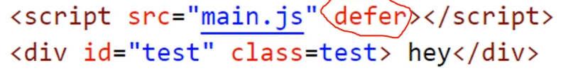 하지만 아래와 같은 인위적인 설정(defer)으로 자스의 코드가 DOM파싱을 막지 않게 해줄수 있다.