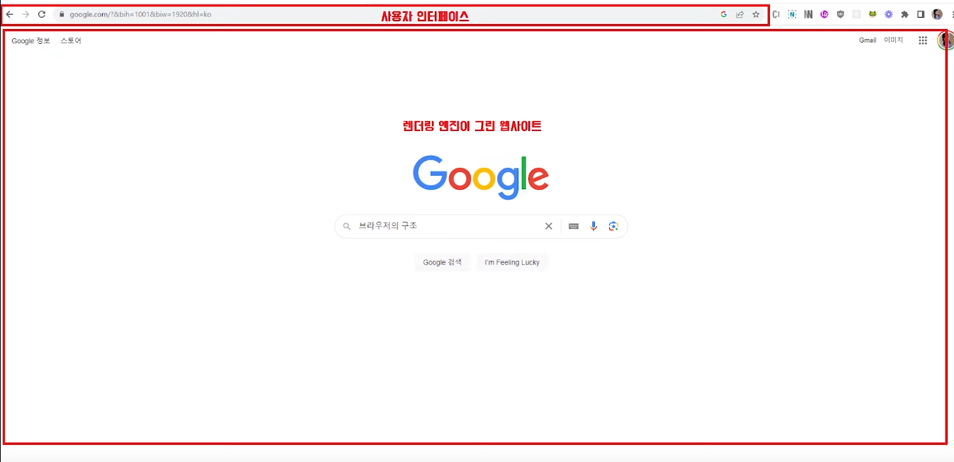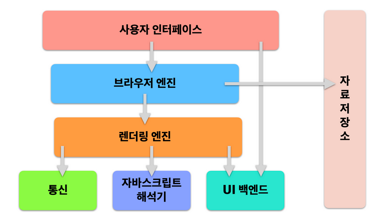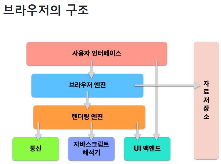 브라우저 엔진이란? 사용자 인터페이스와 렌더링 엔진의 교두보 역할. 예를들어 인터페이스로 뒤로가기 버튼 눌렀다면 이전의 페이지를 가져오라는 명령을 하는 것이 브라우저 엔진이고 그 명령을 실행하는 것이 렌더링 엔진!