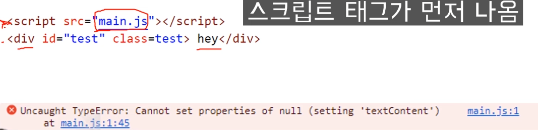 - DOM이 완성되지 않은 상태에서 자바스크립트가 DOM을 조작한다면 에러가 발생한다.