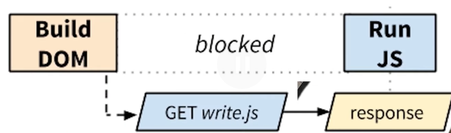 Javasrcipt는 매우 강력함. 무슨 말이냐면 HTML문서로부터 DOM트리를 그리는 와중에 위와 같은 <script src="main.js"> </script>를 만나면 그리고 있던 DOM파싱을 중단시킴. 왜냐하면 자스로 DOM트리까지 그릴수 있기때문임(아래 그림은HTML이 Build DOM을 하는 와중에 자스문서가 호출되면 DOM파싱이 중단(blocked)되는 것을 보인것임). 즉 자스만으로도 노드를 만들수 있기 때문에 굳이 자신만의 세계에서 DOM 트리 구성해도 자스에 의해 다시그려져야 하므로 효율성 측면에서 멈추게 되는 것임.