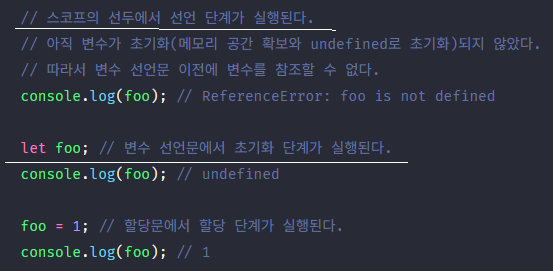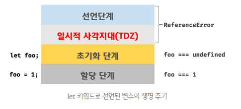 let 키워드로 선언된 변수는 선언 단계와 초기화 단계가 분리되어 진행된다. 즉, 스코프에 변수를 등록(선언단계)하지만 초기화 단계는 변수 선언문에 도달했을 때 이루어진다. 초기화 이전에 변수에 접근하려고 하면 참조 에러(ReferenceError)가 발생한다. 이는 변수가 아직 초기화되지 않았기 때문이다. 다시 말하면 변수를 위한 메모리 공간이 아직 확보되지 않았기 때문이다. 따라서 스코프의 시작 지점부터 초기화 시작 지점까지는 변수를 참조할 수 없다. 스코프의 시작 지점부터 초기화 시작 지점까지의 구간을 ‘일시적 사각지대(Temporal Dead Zone; TDZ)’라고 부른다.