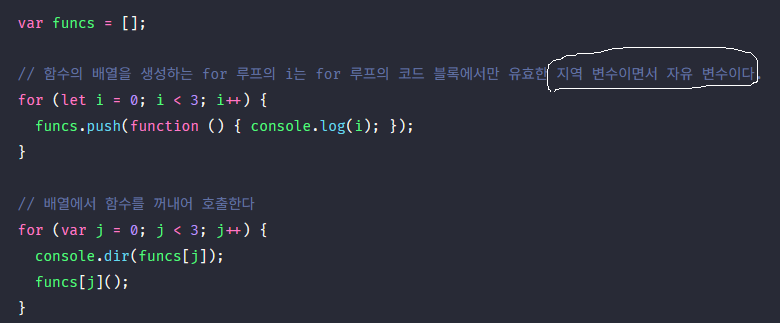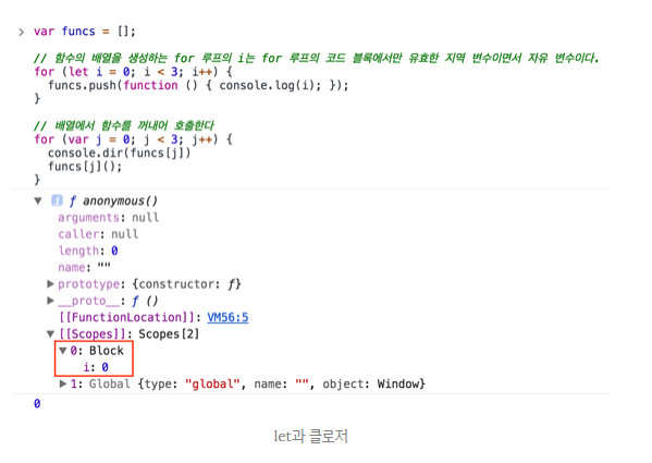 for 루프의 let i는 for loop에서만 유효한 지역 변수이다. 또한, i는 자유 변수로서 for 루프의 생명주기가 종료되어도 변수 i를 참조하는 함수가 존재하는 한 계속 유지된다. (참...ㅋㅋㅋ JS에서는 함수도 객체이므로 이런 표현이 가능한 것이다. Java에서는 객체를 참조하는 참조변수만 존재하면 해당 객체가 Grabage Collector에 의해 처리되지 않는 것처럼 말이다)