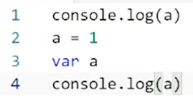 또한 자스에서 변수는 스크립트가 로딩되는 시점에 바로 선언과 초기화(undefined로)를 해버리기 때문에 아래와 같은 코드와 그 결과가 가능한 것이다.