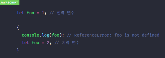 ES6의 let으로 선언된 변수는 블록 레벨 스코프를 가지므로 코드 블록 내에서 선언된 변수 foo는 지역 변수이다. 따라서 지역 변수 foo도 해당 스코프에서 호이스팅되고(해당 스코프 안에서 호이스팅 됨) 코드 블록의 선두부터 초기화가 이루어지는 지점까지 일시적 사각지대(TDZ)에 빠진다. 따라서 전역 변수 foo의 값이 출력되지 않고 참조 에러(ReferenceError)가 발생한다.