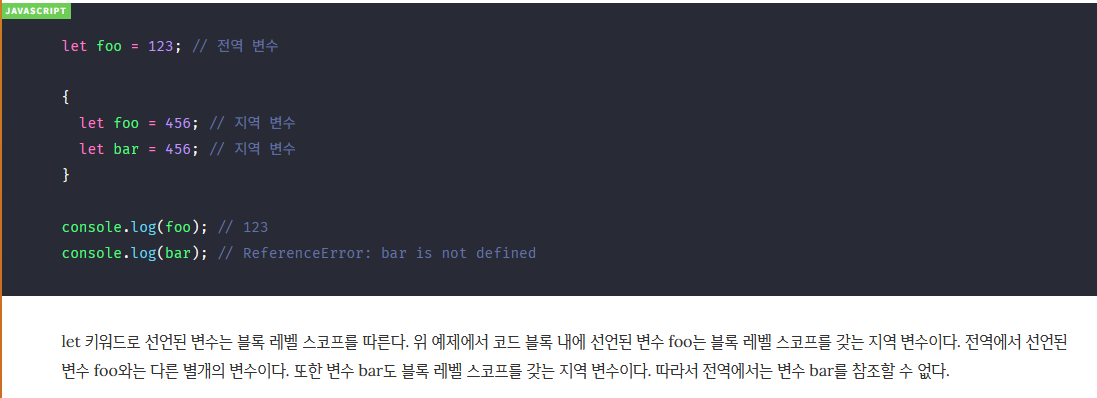 let 키워드로 선언된 변수를 전역 변수로 사용하는 경우, let 전역 변수는 전역 객체의 프로퍼티가 아니다. 즉, window.foo와 같이 접근할 수 없다. let 전역 변수는 보이지 않는 개념적인 블록 내에 존재하게 된다