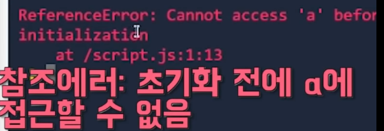 let 또한 호이스팅이 가능합니다. 하지만 let은 TDZ(Temporal Death Zone)라는 것을 만들어 a가 호이스팅 되긴 하였으나 실제로 a에 대한 선언문이 나오기 전에는 a에 접근할 수 없다는 것이다(즉 호이스팅은 되었지만 호이스팅이 되지 않는 것처럼 동작하기 위해TDZ존을 두는 것이 let이다).