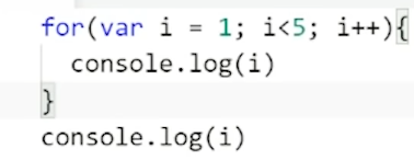 아래코드에서 i는 지역변수로 블럭 밖에서 console.log(i)라고 호출되면 이는 에러를 발생시켜야 하는데 그렇지 않다. 그 이유는 i가 var로 선언되었기 때문이고 var는 함수만 지역변수로 호이스팅되고 나머지는 모두 전역변수로 호이스팅하기 때문이다.