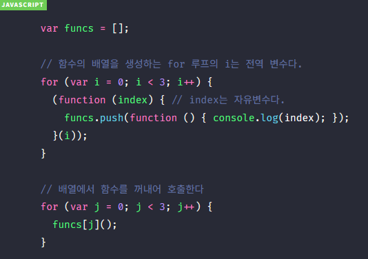 위 코드의 실행 결과로 0, 1, 2를 기대할 수도 있지만 결과는 3이 세 번 출력된다. 그 이유는 for 루프의 var i가 전역 변수이기 때문이다. 0, 1, 2를 출력하려면 아래와 같은 코드가 필요하다.