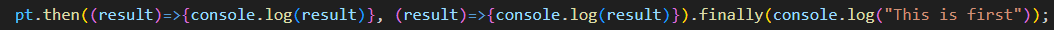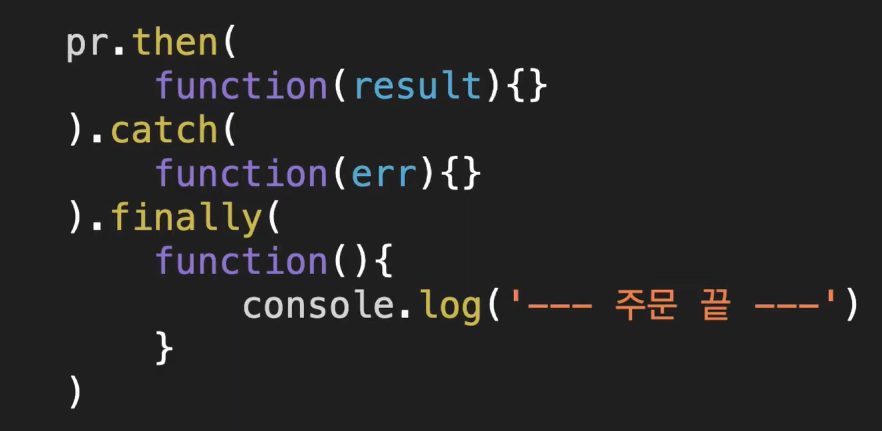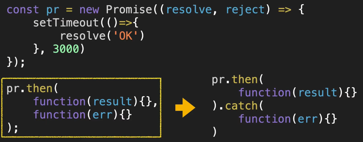 pr에는 Promise객체가 담겨 있으므로 result값을 알수 있음. then함수의 첫번째 인자로는 성공했을때 실행되는 함수가 오고 그 인자로는 Promise객체의 property인 result가 오게됨. 반대로 두번째 인자에는 실패했을때 실행되는 함수가 도게 되고 그 함수의 인자로는 error가 전달됨. then함수를 실제로 작성하면 아래와 같은 모습임이 예에서는 setTimeout함수안의 함수로 resolve가 왔으므로 pr.then의 두번째 인자인 function(err){}가 실행될 수없고 function(result)만이 실행되게 만들어 놓음. 이렇게 기본적으로 then함수는 2개의 인자를 받지만 다음과 같이 catch문을 사용하면 오직 하나의 인자만 받도록 구성할 수도 있음. 이 함수와 아래의 함수는 동일하게 동작함.이렇게 함수를 구성하면 혹시나 function(result){}함수를 실행하면서 발생하는 에러도 한번에 잡을 수 있게 되는 효과가 있음. 또한 우측과 같이 작성하는 것이 가독성이 더 좋음.