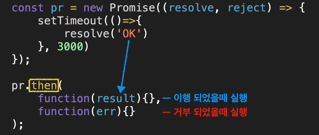 pt.then(result=>{//resolve함수를 호출하면서 전달된 인자인arr이 result로 전달되는 것!즉, 위에서와 같이 resolve는 항상 인자와 함께 호출되어야 함.