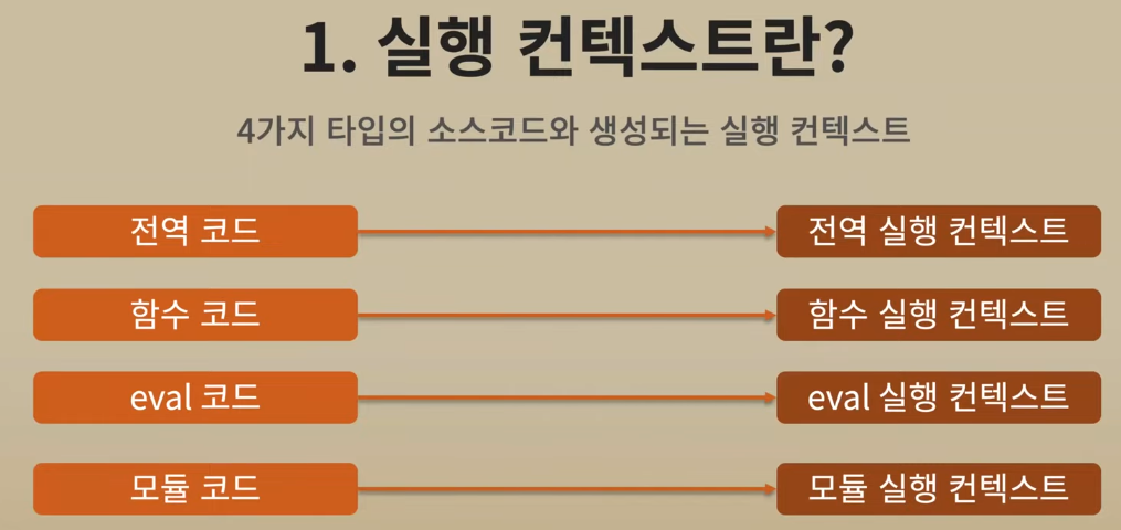 요약: 실행 컨텍스트이란? 코드를 실행하는데 필요한 환경을 제공하는 객체. 여기서 환경이란 코드 실행에 영향을 주는 조건이나 상태를 의미함. 식별자 결정을 더욱 효율적으로 하기 위한 수단으로써 필요한 정보를 한곳에 모아 제공하는 객체.