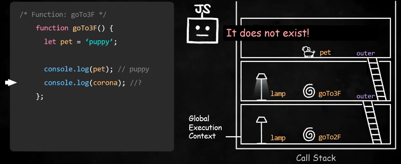 스코프체이닝이란? 식별자를 결정하기 위해 활용하는 스코프들의 연결리스트콜스텍에서는 가장 최근에 실행된 실행컨텍스트만 활성화됨. 콜스텍(Call stack, 실행컨텍스트)은 자바의 함수스텍이랑 똑같다. 가장 최근에 실행된 컨텍스트만 활성화되고 함수가 종료되면 해당 실행컨텍스트도 사라진다.