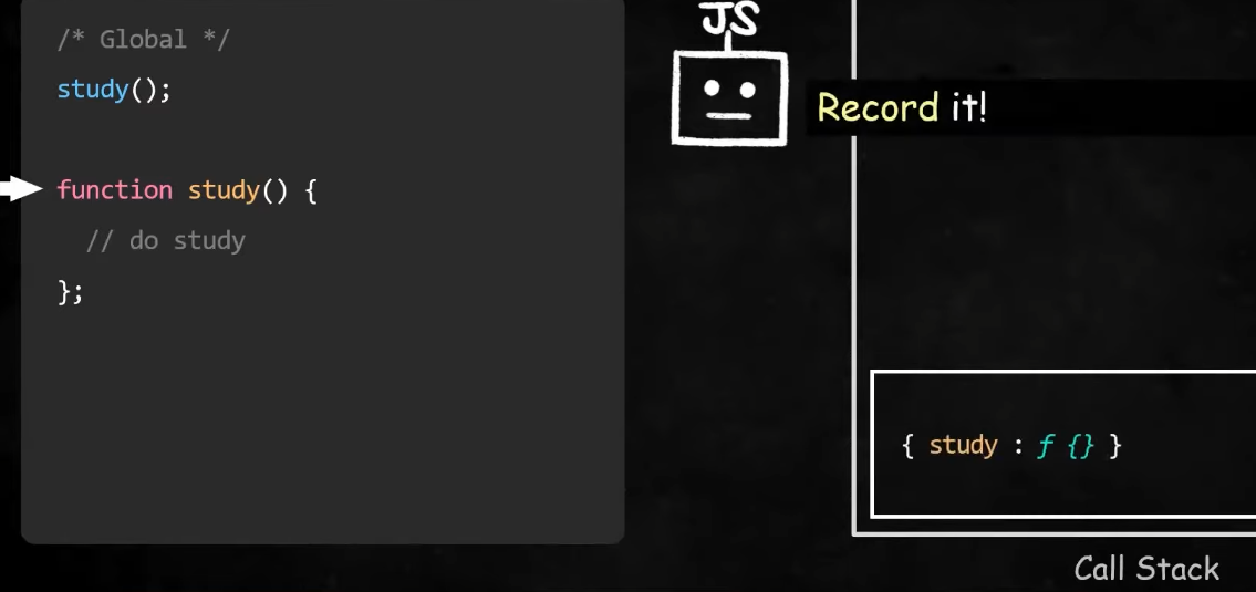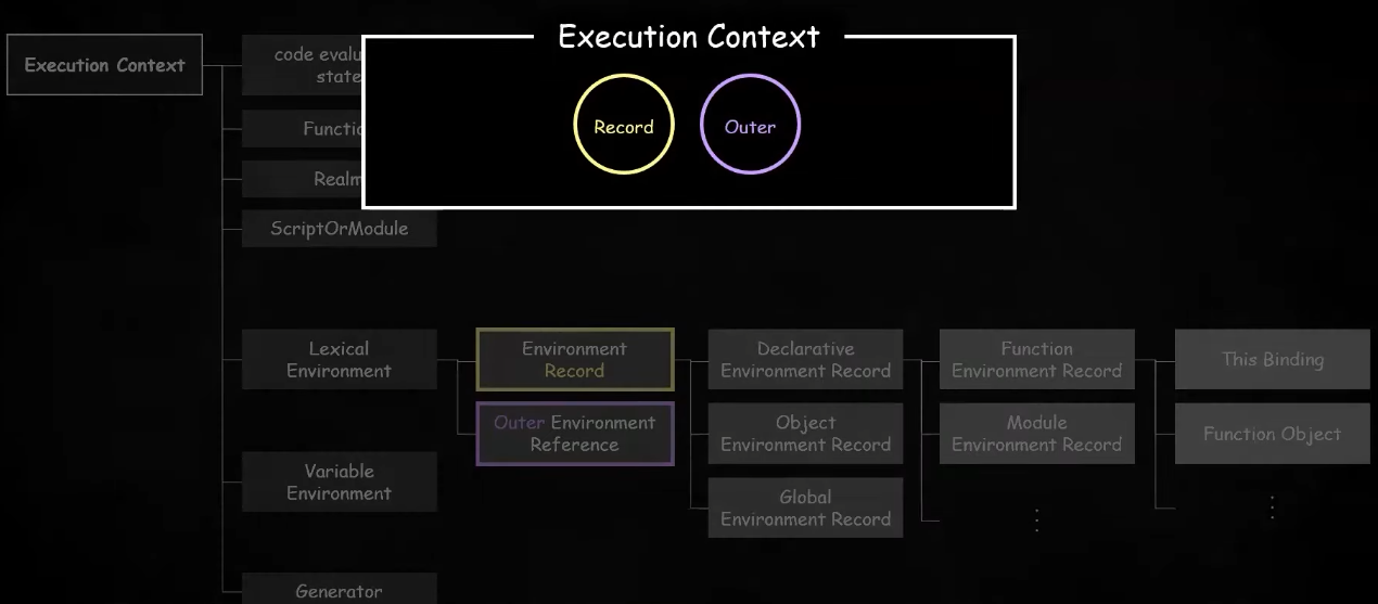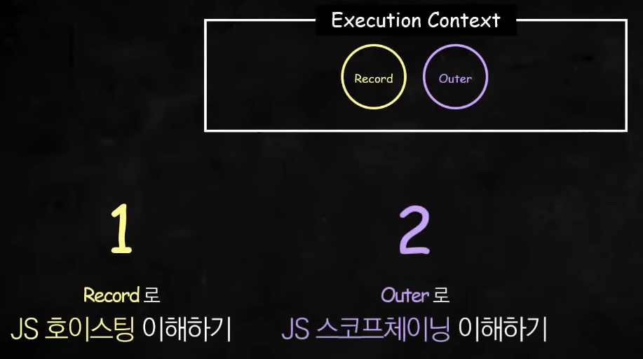 로딩시점에 Js engine이 먼저 코드를 스켄하면서 변수정보를 실행컨텍스트의 환경 레코드에 기록함. Environment record란 식별자와 식별자에 연결된 값을 기록하는 객체이다. 환경레코드에 변수가 어떻게 기록되는지만 잘 알아도 호이스팅을 바로 이해할 수 있다.