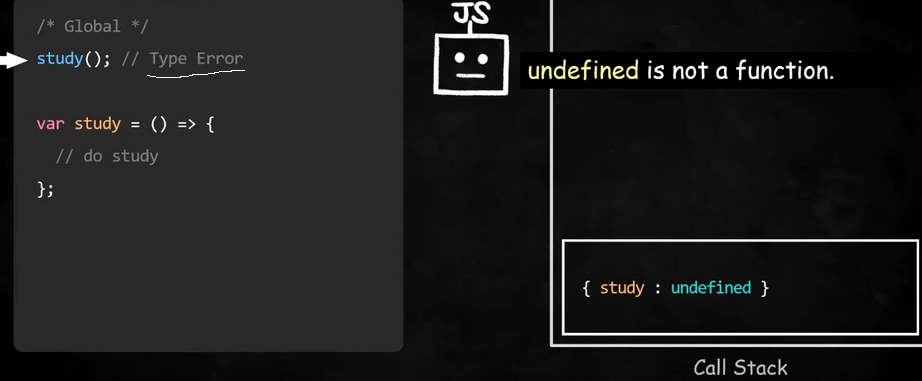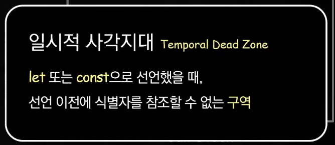 var 키워드로 변수를 선언한 경우 선언과 초기화가 동시에 이루어짐(우선은 undefined로 초기화됨). 하지만 let, const로 변수를 선언한 경우는 선언만 환경 레코드에 기록되고(이때 초기화는 이루어지지 않아 값을 위한 메모리 공간조차 마련되어 있지 않은 상태임) 초기화는 선언문에 가서 이루어짐.